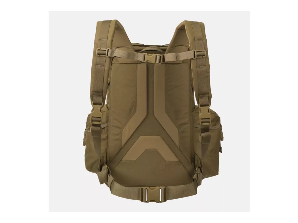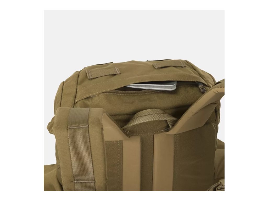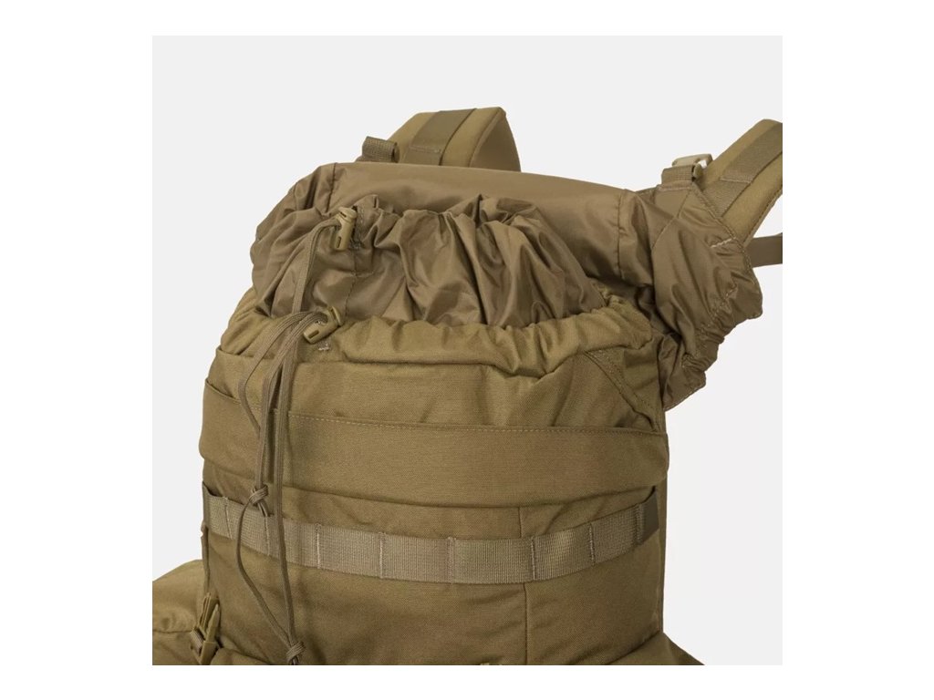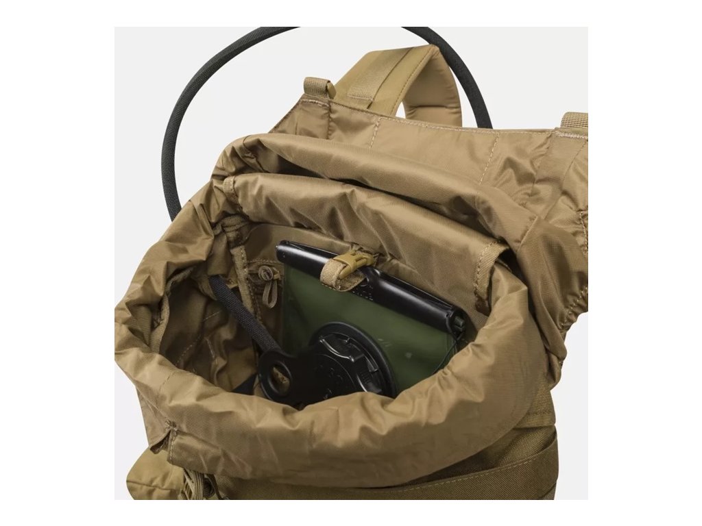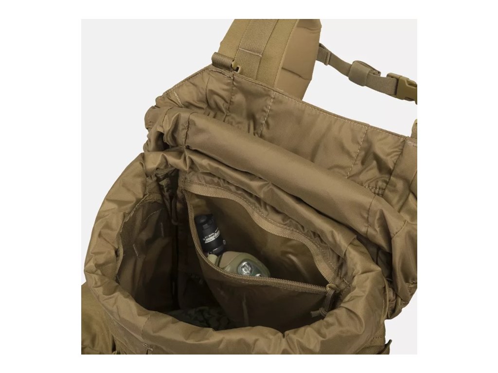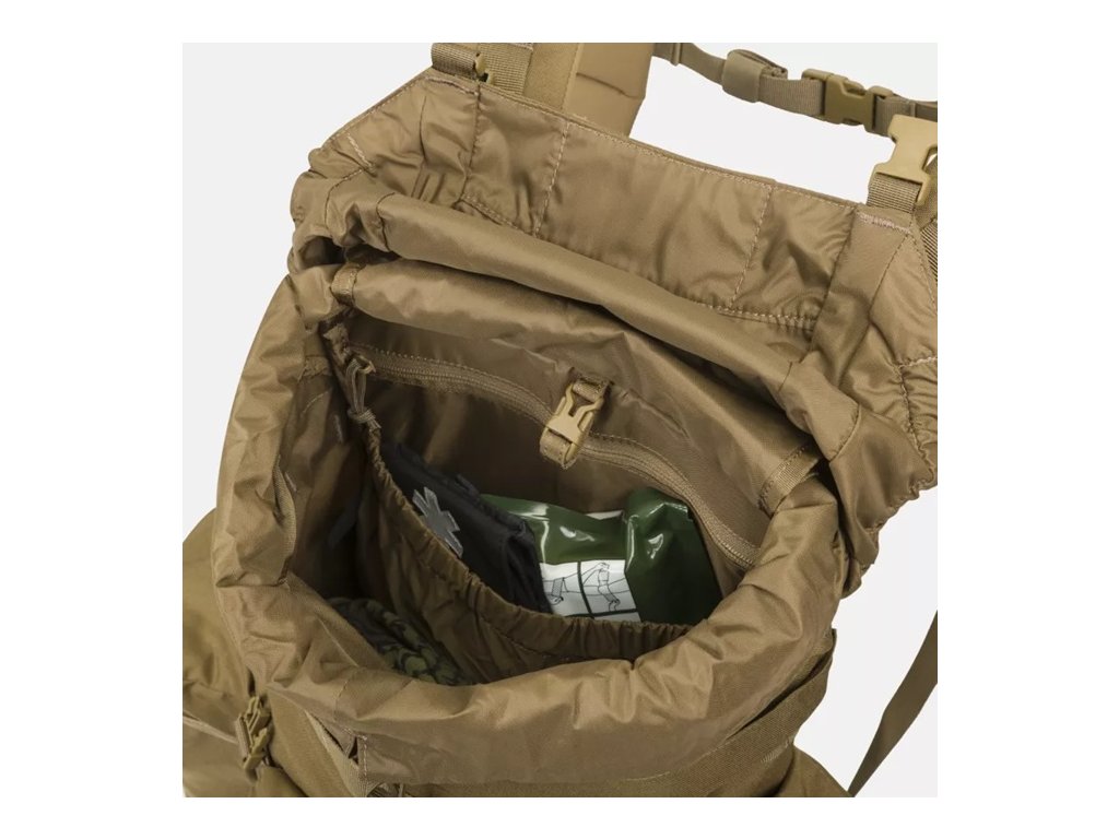 Pod klopou se nachází stahovací šňůrka a komín hlavní přihrádky, který umožňuje nastavit výšku batohu v závislosti na jeho naplnění a zároveň chrání obsah před povětrnostními vlivy. Hlavní přihrádka je prostorná a obsahuje vyhrazený prostor pro hydratační vak a plochou kapsu na zip pro bezpečné nošení dokumentů nebo cenných drobností. Pod vnějšími kapsami lze nosit nezbytné bushcraftové nářadí: dvě průchozí (např. na sekeru) a tři neprůchozí (na nůž nebo skládací pilu). Zesílené dno batohu má všité popruhy pro připevnění spacáku nebo bundy.