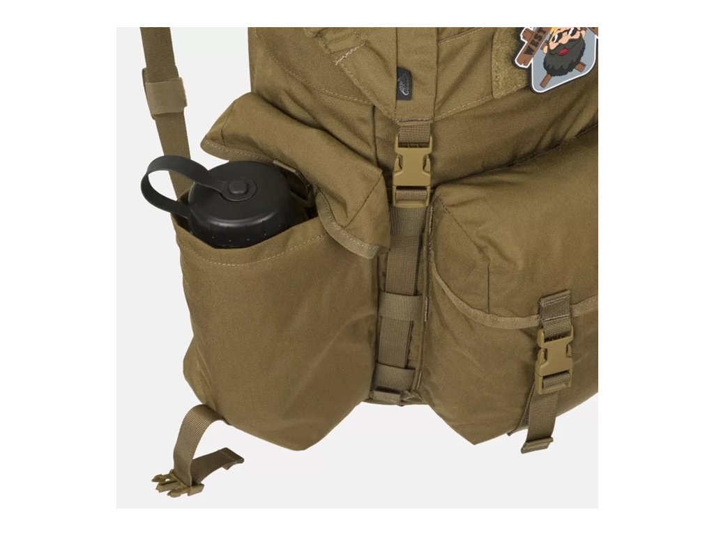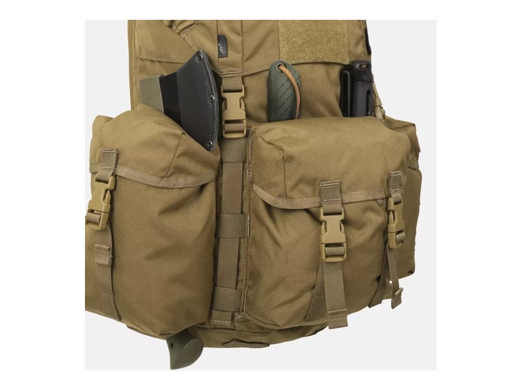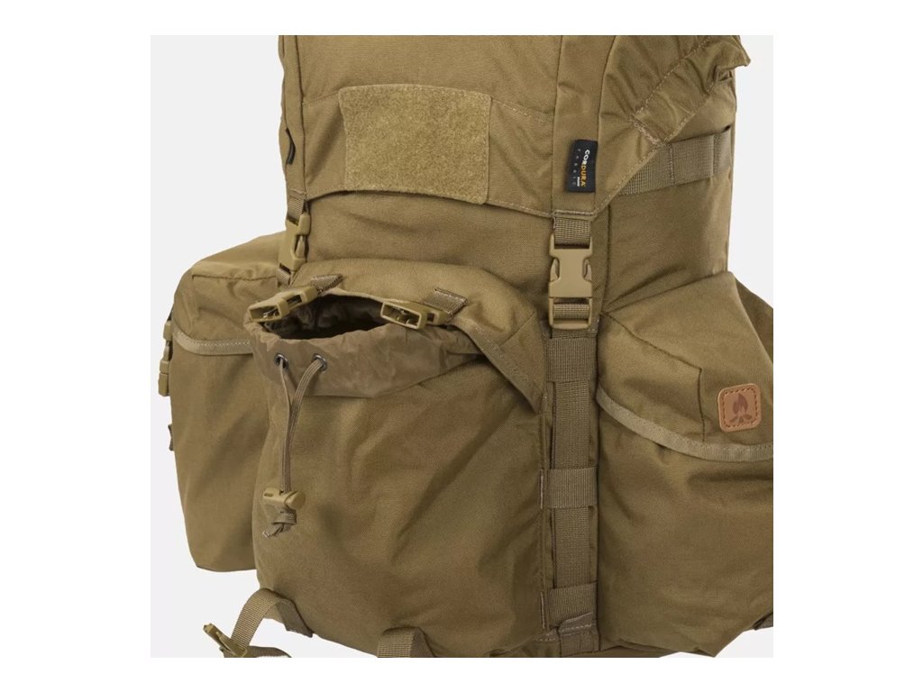 Každá kapsa je uzavřena klopami zajištěnými přezkami typu fastex. Těsně nad nimi je jedna dlouhá řada popruhů kompatibilních s MOLLE/PALS, kam si můžete připevnit rukavice a další kapsy, nebo je v případě potřeby zakrýt látkovou klopou. To umožňuje přizpůsobit batoh Bergen profilu aktivity uživatele: zachovat bushcraftový vzhled nebo zdůraznit taktické prvky. Nad hlavní přihrádkou je také plochá kapsa na drobnosti.