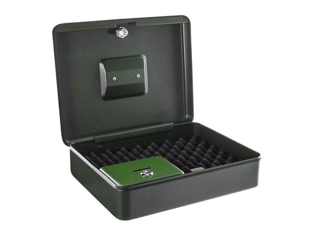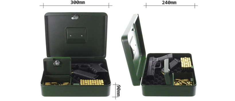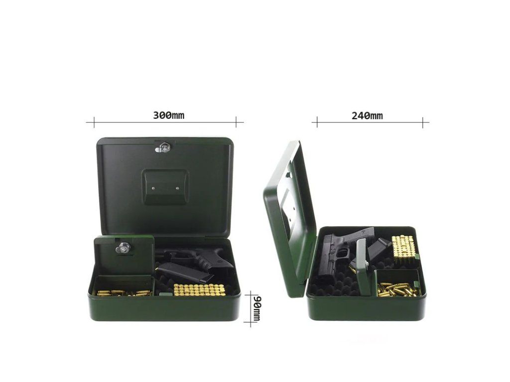 Zelený ocelový box určený pro krátkou zbraň a munici nabízí bezpečné uzamčení i pohodlné přenášení díky zapuštěné pozinkované rukojeti. Vnitřek boxu je opatřen měkkou pěnovou vložkou, která chrání zbraň před případným poškozením během transportu. Uvnitř je také malá, samostatně uzamykatelná kazeta, ideální pro bezpečné uložení munice. Zbraň a munice tak budou uskladněny na jednom místě pod vaší kontrolou.