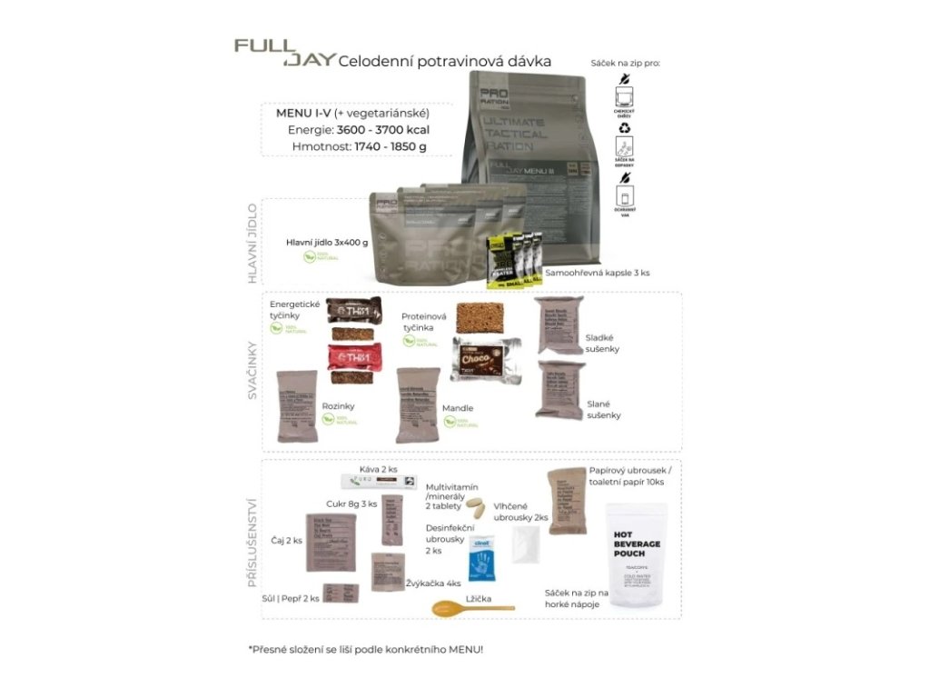 Obsah balení: | 3x hlavní jídlo, 3x lžíce, 3x bezplamenný ohřívač, svačina, nápoj, doplňky |