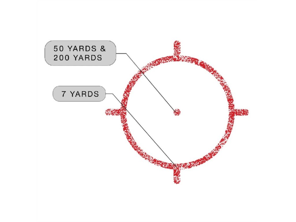 Záměrný obrazecSpeed ring 68 MOA s tečkou 1 MOA umožňuje rychlé zaměřování cíle a poskytuje tři zaměřovací body, kalibrované pro ráže .223 Cal. 62 Gr., 2 900 Vel. Jiné ráže lze použít po určení vzdálenosti. U brokovnic kroužek přibližuje vzory výstřelů, které se liší v závislosti na typu tlumiče a náboje. |
