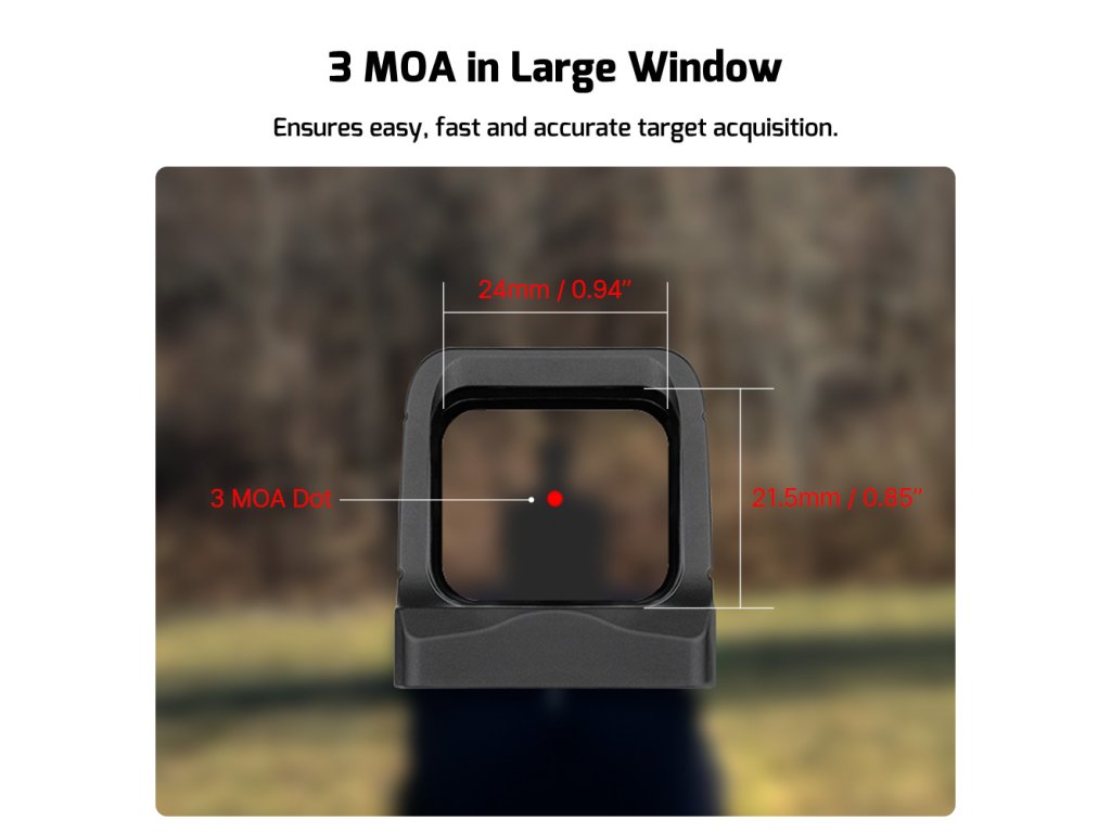 3 MOA tečka ve velkém okně: Tato optika se může pochlubit sklem o rozměrech 0,94 x 0,85 palce, která zajišťuje přesné zaměření i uprostřed zpětného rázu. Bod 3 MOA zřetelně vyniká pro rychlé a přesné zaměření.