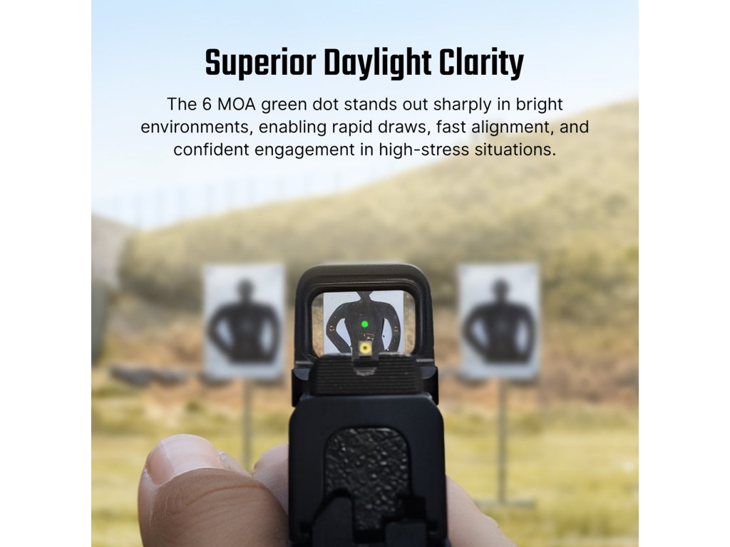 Rychlejší zaměření cíle se 6 MOATato optika se může pochlubit tenkým rámem a sklem o velikosti 0,83 x 0,55 palců. Záměrný bod o velikosti 6 MOA se zelenou tečkou nabízí rychlejší zaměřování cíle, vynikající viditelnost za denního světla a rychlejší zarovnání. Je proto ideální pro scénáře s vysokou zátěží, jako je sebeobrana, domácí obrana či služební použití. Tato velikost záměrného bodu je ideální pro střelbu na krátké vzdálenosti (do 50 metrů), například při dynamické střelbě z pistole nebo na blízko, kde je rychlé zachycení bodu klíčové. |