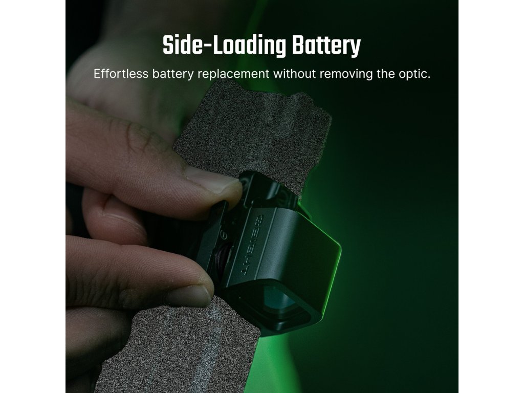 Kolimátor používá baterii CR1620 s bočním vkládáním, takže baterii lze vyměnit bez sundání optiky ze zbraně a bez nutnosti nového nastřelení.