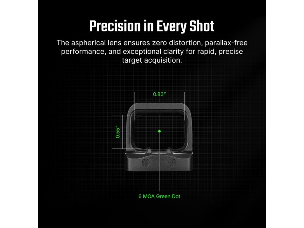 Je vybaven asférickou čočkou, která zajišťuje nulové zkreslení, bezparalaxový výkon a vysokou optickou čistotu pro rychlé a přesné zaměření.