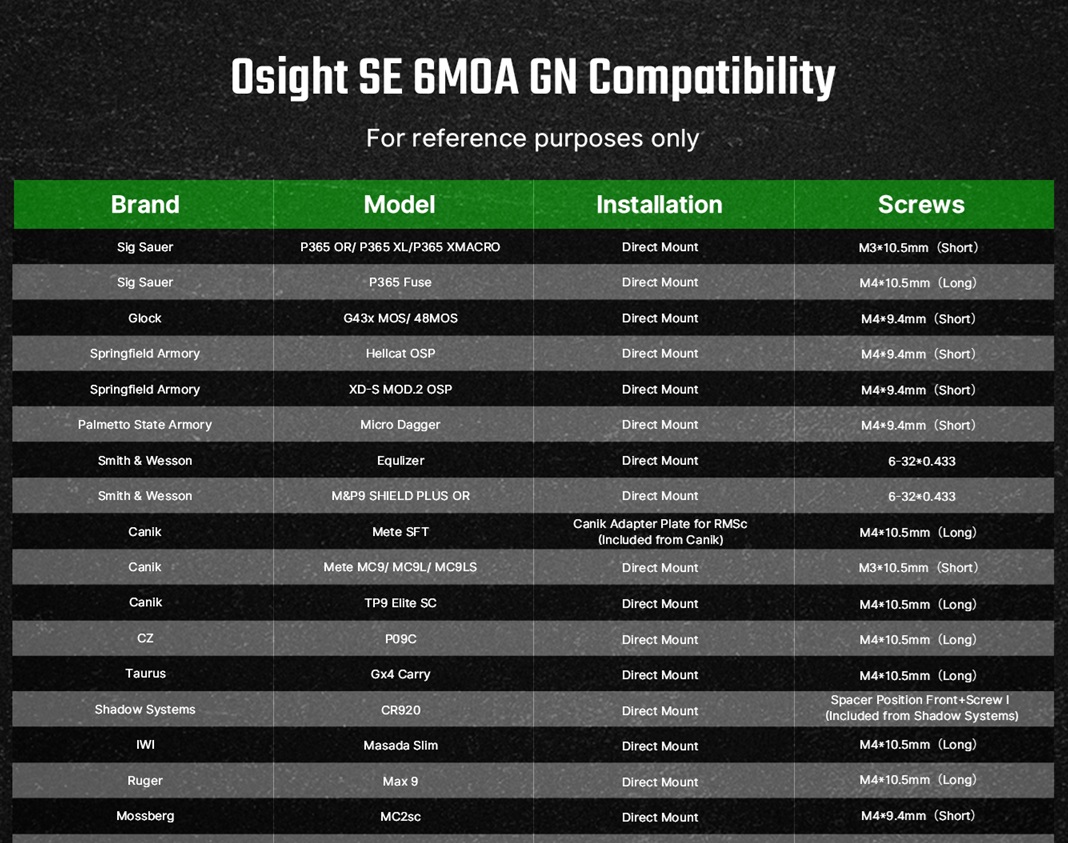 Díky použití nejběžnější standardní montážní stopy pro menší zbraně zajišťuje systém Osight širokou kompatibilitu s celou řadou zbraňových výrobců.