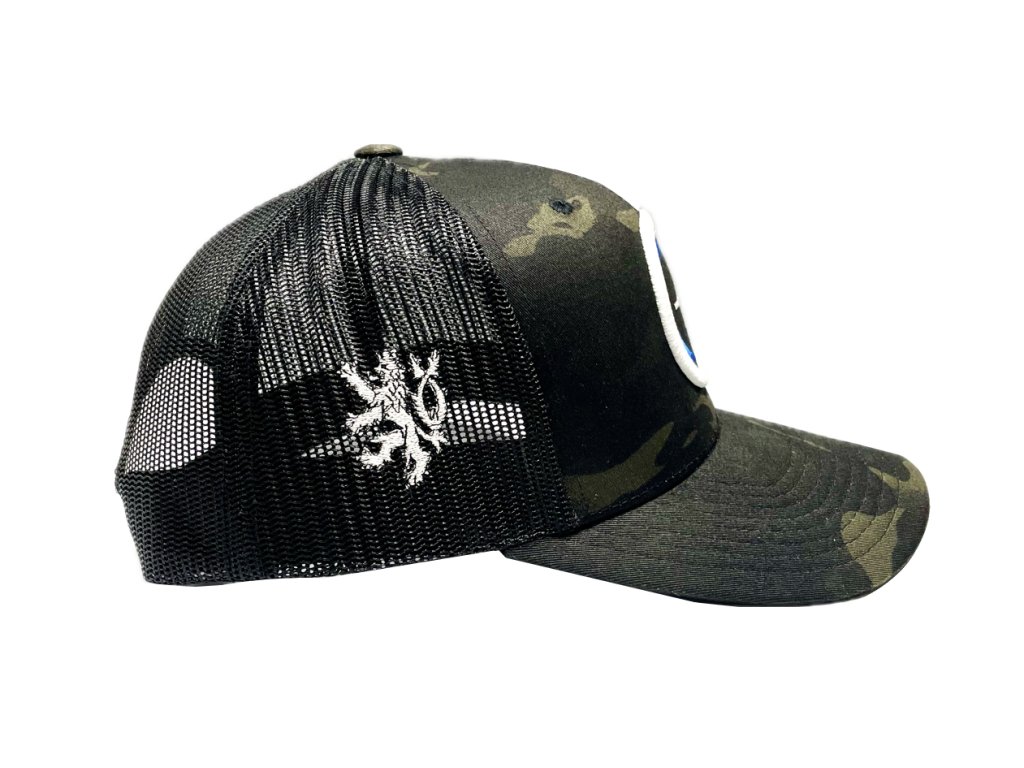 - Snapback kšiltovka typu „trucker“ ve vzoru MultiCam Black.
