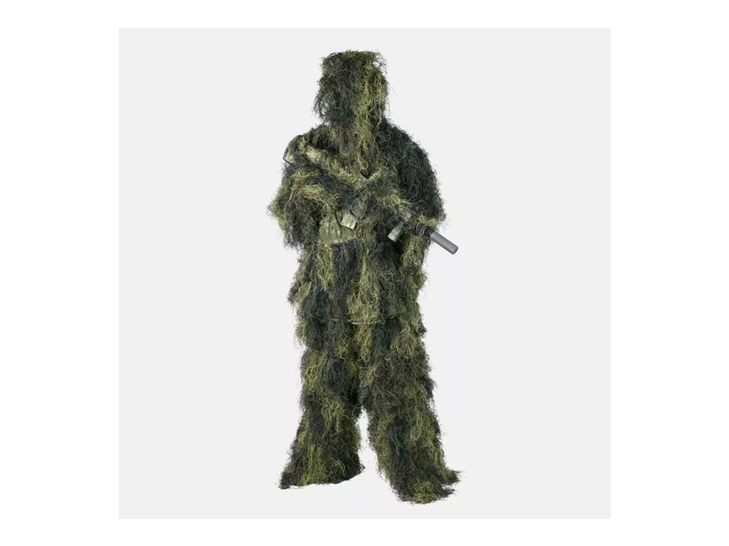 Maskovací oblek Ghillie Suit je vyroben z prodyšné síťoviny s prvky v maskovacích barvách, které rozmazávají siluetu.