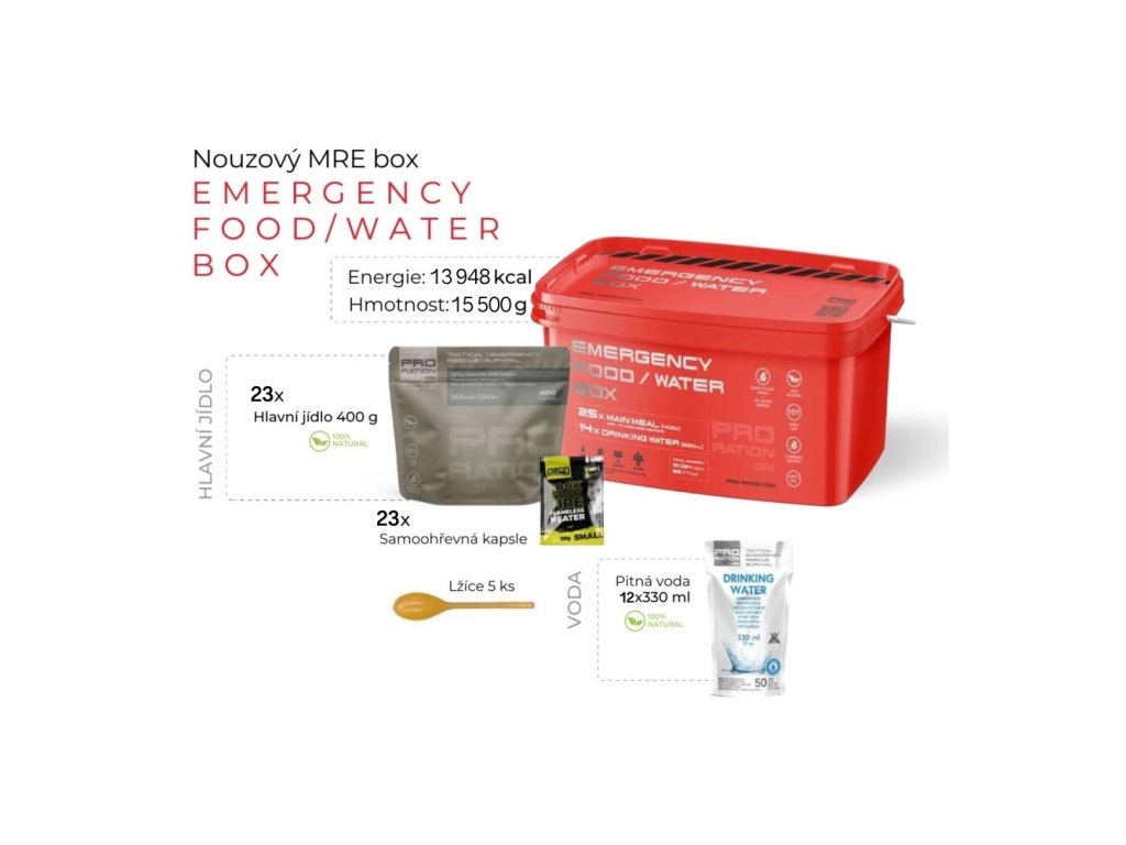 Nouzový balíček Emergency food/water box od českého výrobce Adventure Menu je navržen tak, aby pokryl základní potřeby v případě nouze. I když nepřejeme nikomu nic zlého, občas se může stát že je nutné opustit svůj domov ve spěchu, kdy až po prodělání prvotního šoku si uvědomíte, že nemáte s sebou nic na zajištění základních životních potřeb (požáry, povodně, válka a jiné katastrofy). Tento profesionální produkt z řady Pro Ration obsahuje 23 hlavních jídel, 12 balíčků pitné vody po 330 ml a 2× zipper bag (sáček použitelný pro ohřátí jídla). Součástí balení jsou i samohřívací kapsle (celkem 25), když není po ruce zdroj tepla a samozřejmostí jsou i lžíce pro konzumaci pokrmu.
