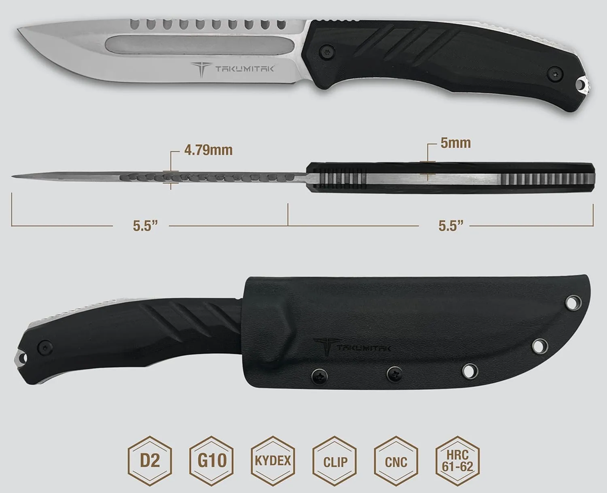 Nože Takumitak Exit Point se vyznačují velmi silnou 4,79 mm CNC obráběnou čepelí Full Tang D2 Steel Drop Point s plochým výbrusem. Třmen je pokryt CNC obráběnými střenkami rukojeti G10 a nůž je vsazen do pouzdra z kydexu, které udržuje tlak. Klip připravený pro systém MOLLE umožňuje vertikální i horizontální nošení a lze jej přepnout pro použití vlevo nebo vpravo.