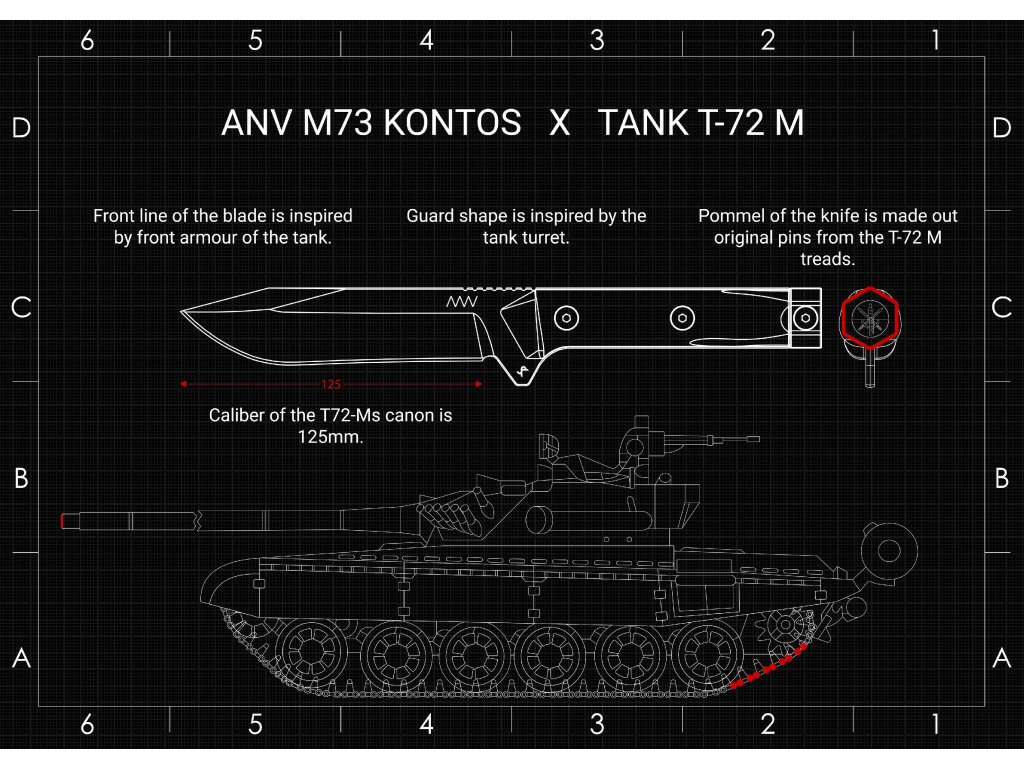 V páteři nože vidíme přísně rovnou horní plochu korby tanku, přední falešné ostří pro nás ztělesňuje sekeru, tedy přední pancéřovou část tanku a nakonec samotné ostří kopíruje stejnou křivku jako vana korby v prostoru pod řidičem tanku.” Četař Petr Stach a rotmistr Petr Knot ze 73. tankového praporu také chtěli zachovat symboliku značení věžového čísla, proto ANV nože označili sériovým číslem právě na záštitě, která stejně jako věž, vystupuje z těla tanku/ nože. Největší výzvou bylo jednoznačně osazení patky rukojeti pásovým čepem tanku. Důležité bylo hlavně vyvedení profilace střenek tak, aby byla rukojeť i přes svou neortodoxní konturu stále pohodlná a funkční. “Chtěli jsme do nože také vtisknou trochu symboliky, proto má rukojeť tři šroubové sety, stejně jako má náš prapor tři tankové roty,” popisuje rtm. Knot. “Navíc každá četa má tři osádky a každou osádku tvoří tři chlapi,” uzavírá popis výsledku spolupráce na vzniku nože M73 Kontos četař Stach.