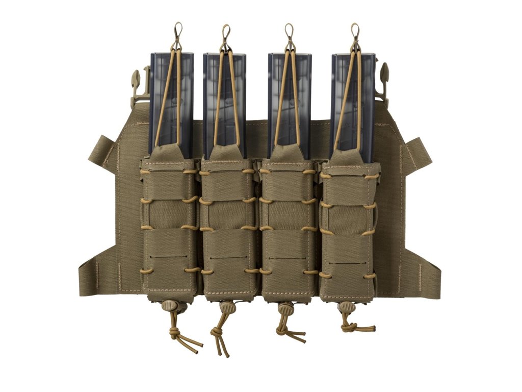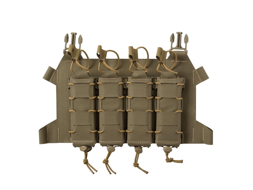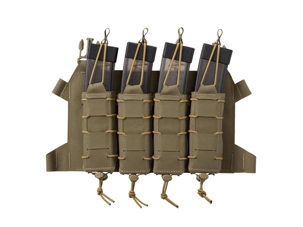 Extrémně lehké pouzdro určené pro čtyři zásobníky pro samopaly, včetně MP5 nebo dokonce Scorpion Evo. Kryté laserově řezaným modulárním systémem kompatibilním s MOLLE/PALS. Pouzdro bude perfektně fungovat s nosiči plátů BEARCAT® a SPITFIRE®. Zásobníky jsou shora zajištěny elastickými šňůrami s poutky Hypalon®. Pouzdro se k nosiči plátů připevňuje pomocí dvou bočních přezek. S přídavným rozhraním ho lze proměnit v kompaktní hrudní popruh.