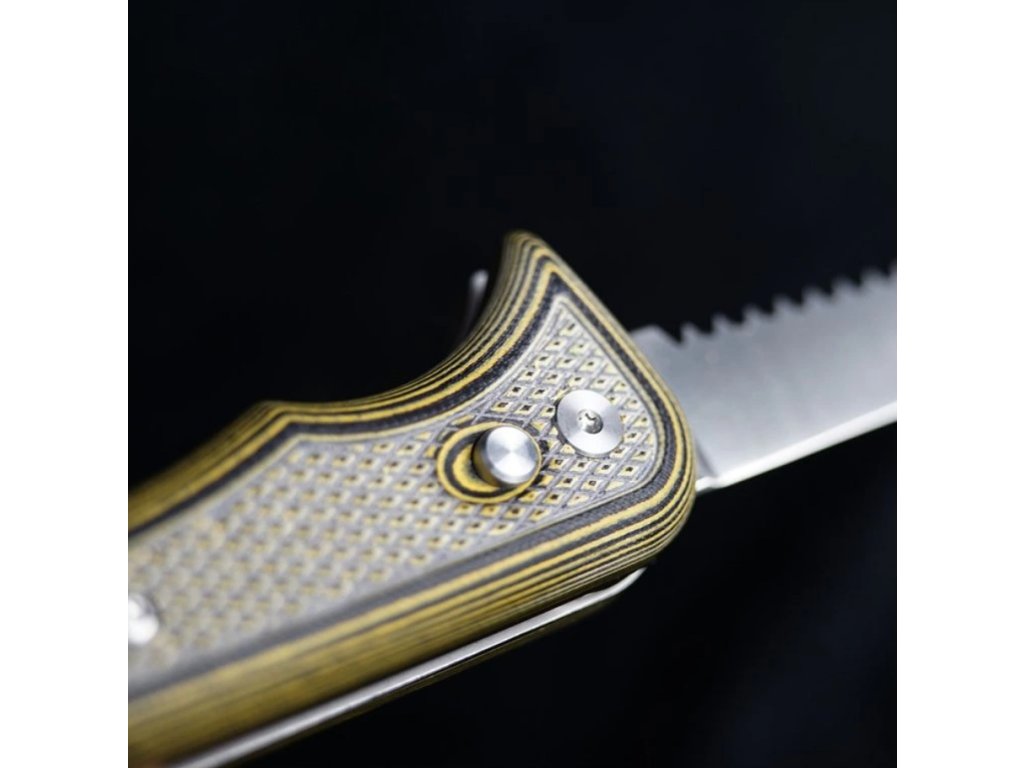 Zeleno černá rukojeť je vyrobena z odolného materiálu G10 a je doplněna stříbrnými šroubky a pojistkou button lock proti zavření nože. Tento elegantní a jedinečný design dodává noži luxusní vzhled.