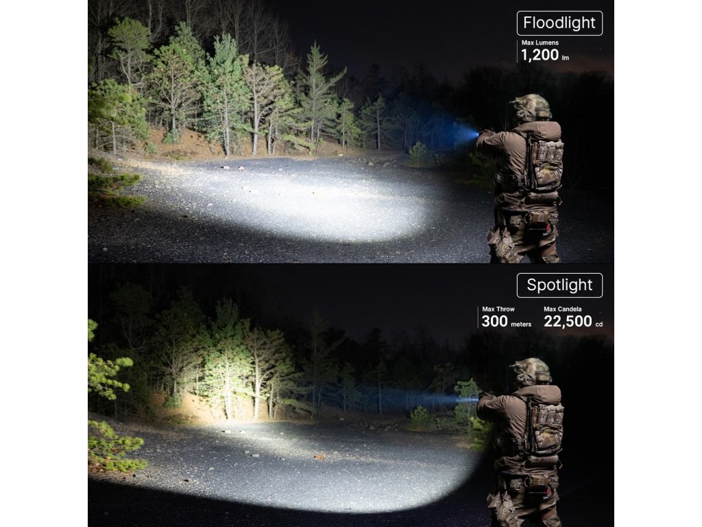 - Dva nezávislé paprsky - širokoúhlý (1200 lumen) a bodový (900 lumen).