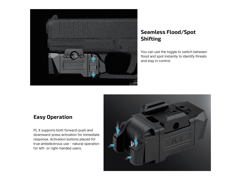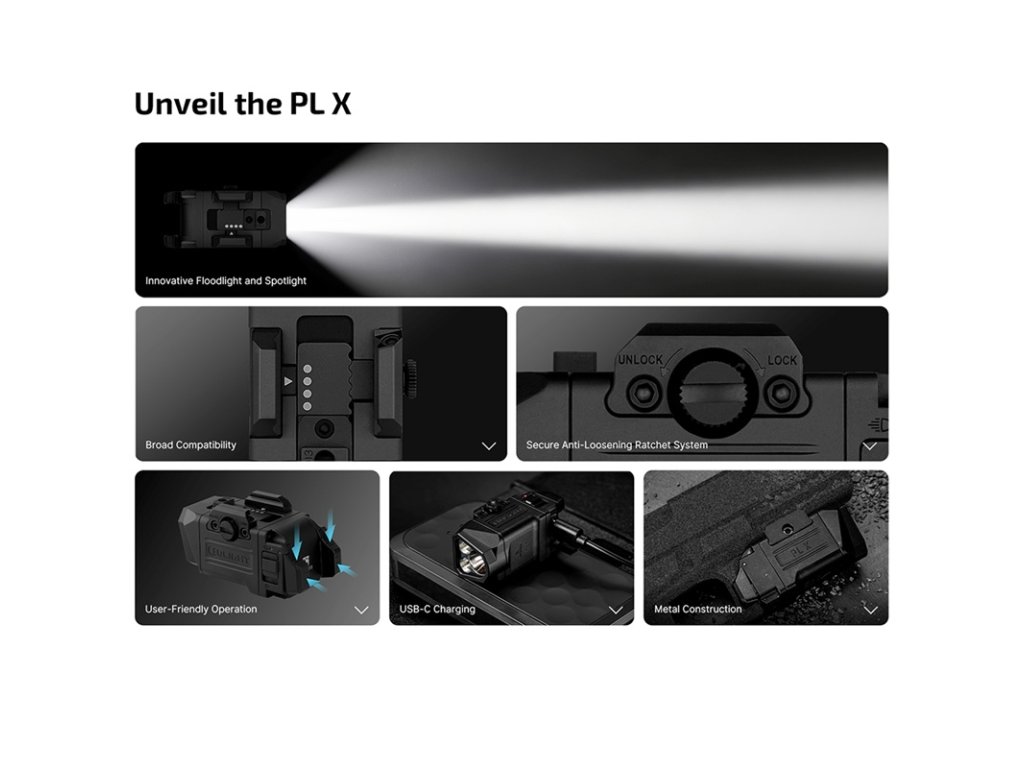 Olight PL-X je taktická zbraňová LED svítilna určená pro montáž na picatinny/Glock lištu, nabízející duální paprsek (široký floodlight a úzký spotlight) s vysokým výkonem a dobíjecí baterií.
