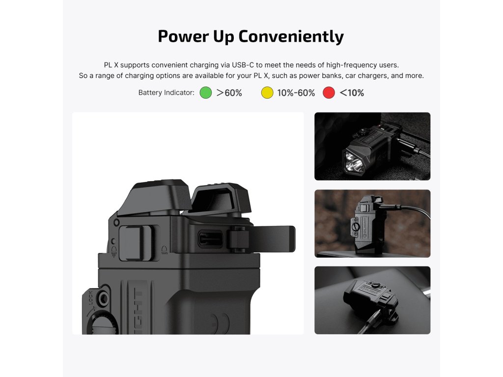 PL-X používá patentovaný anti-loosening ratchet mount (mechanismus proti povolování) s možností přizpůsobení na různé lišty (včetně Glock a 1913). To zajišťuje stabilní upevnění i při natažení.