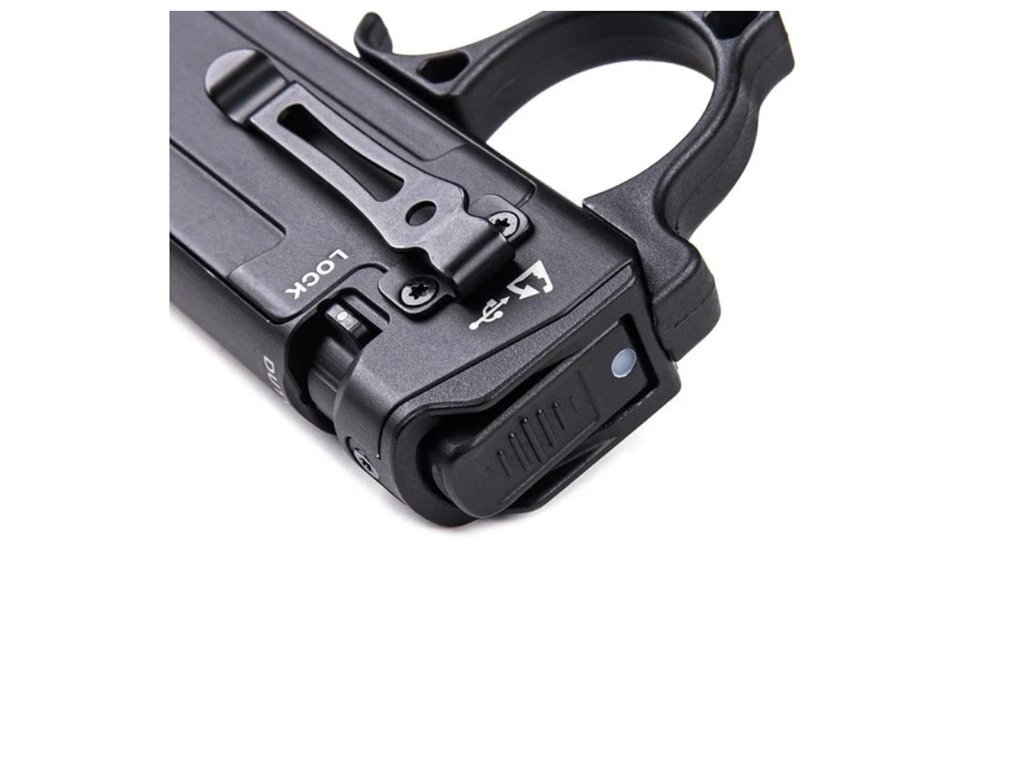 Ovládání a funkceSvítilna se ovládá dvoustupňovým zadním spínačem a otočným voličem režimů. Poloviční stisk dvoustupňového zadního spínače vám umožní okamžité zapnutí svítilny na plný výkon a jeho plné stisknutí spustí stroboskop s výkonem 3500 lumenů pro dezorientaci nebo potlačení cílů. Otočný volič režimů pak nabízí výběr ze tří možností – Taktický, Pracovní a Zámek, které umožňují rychlé ovládání naslepo.