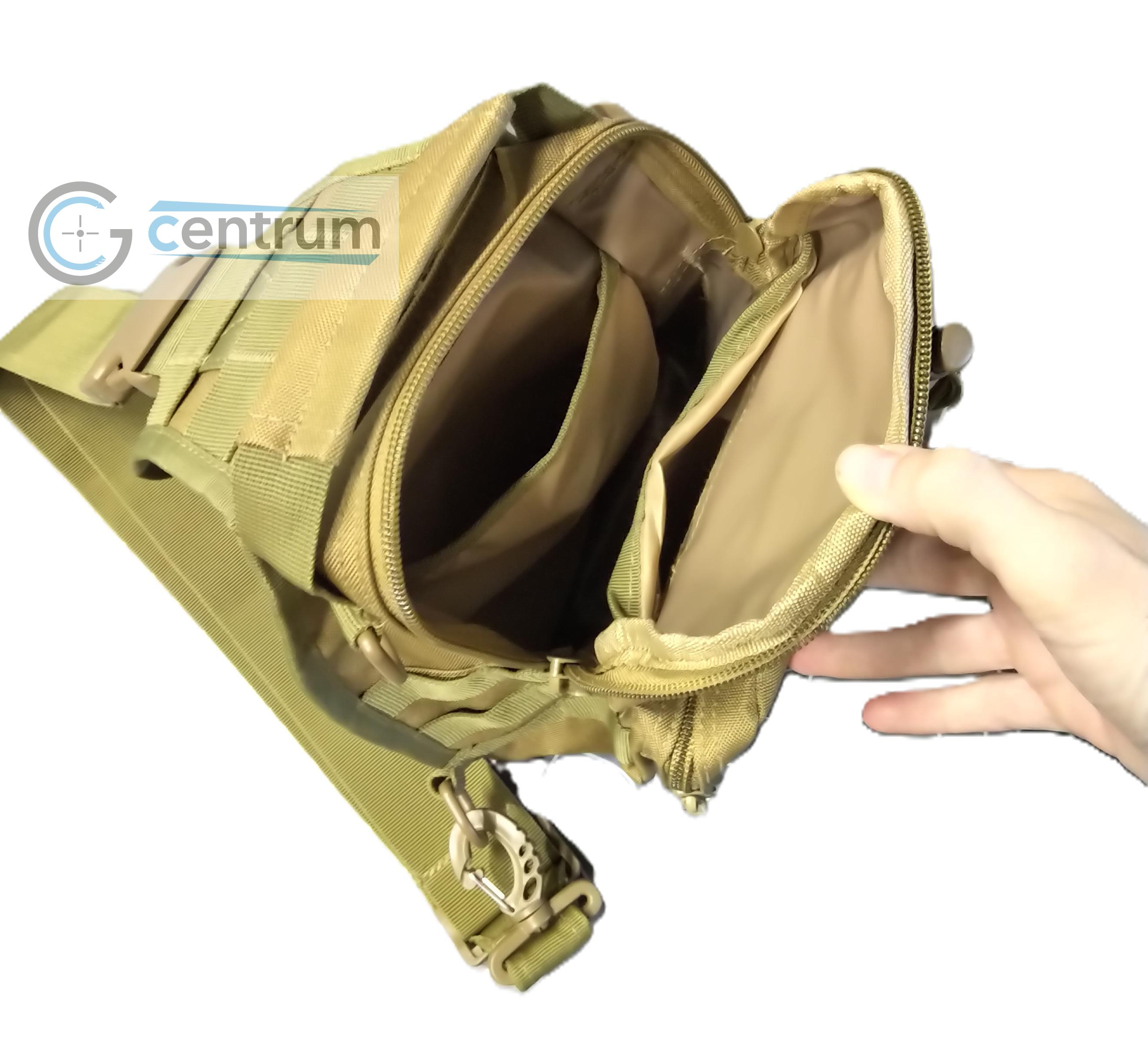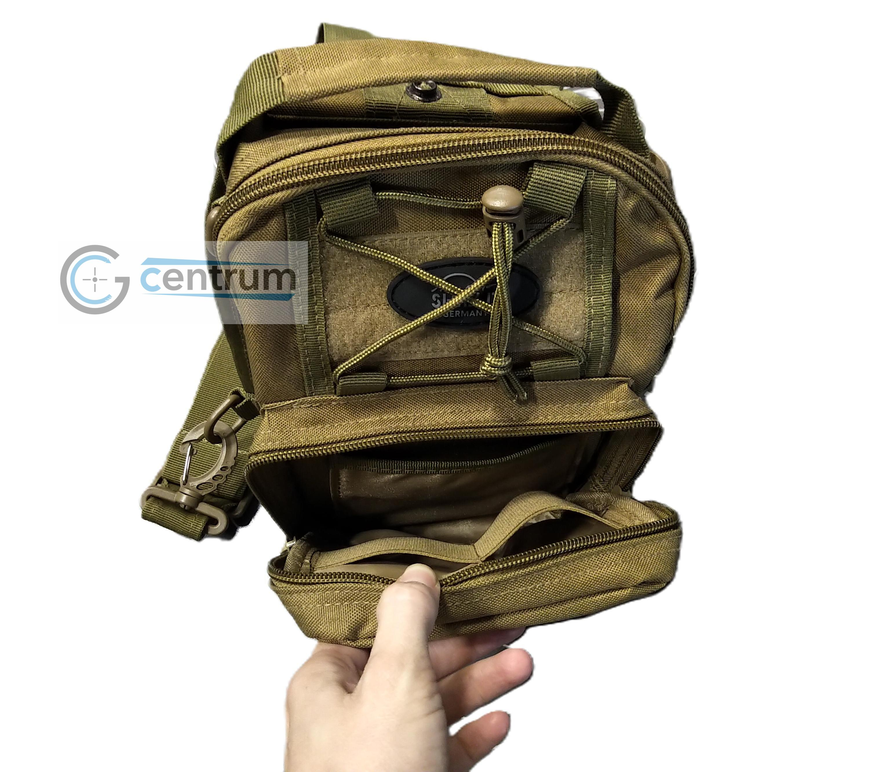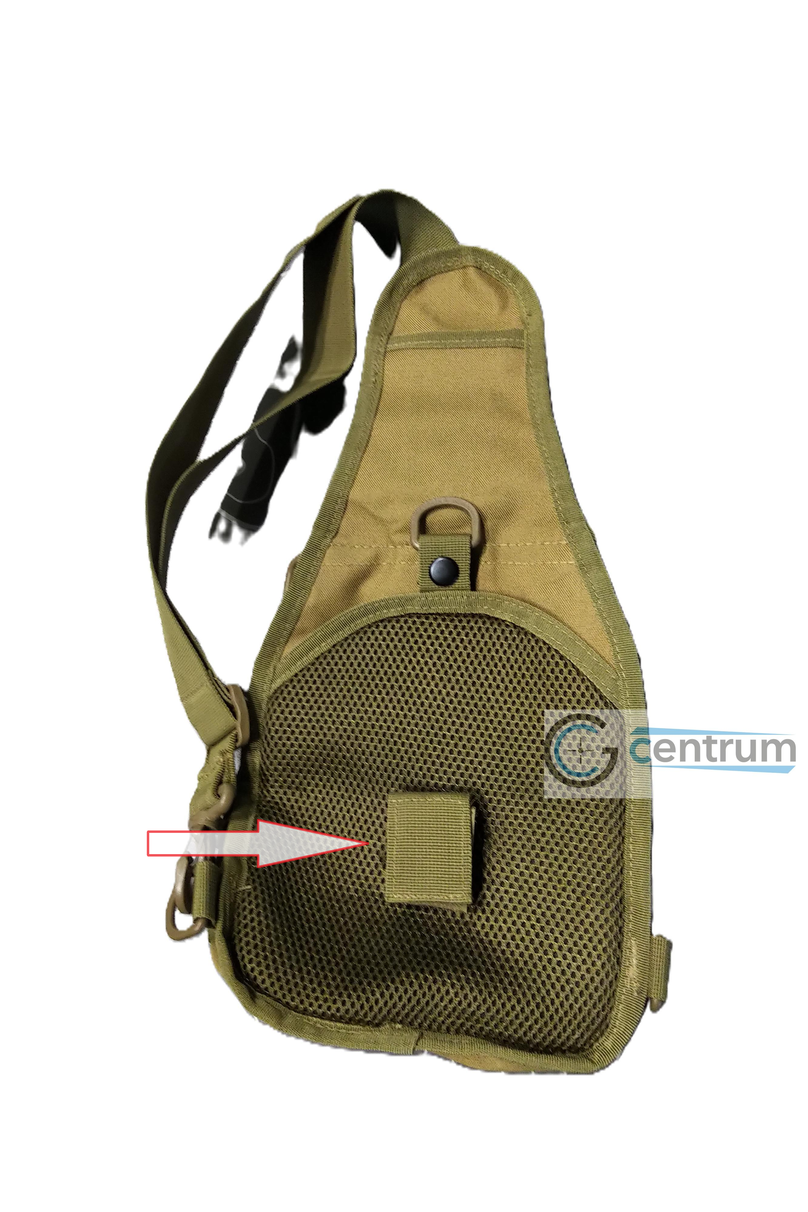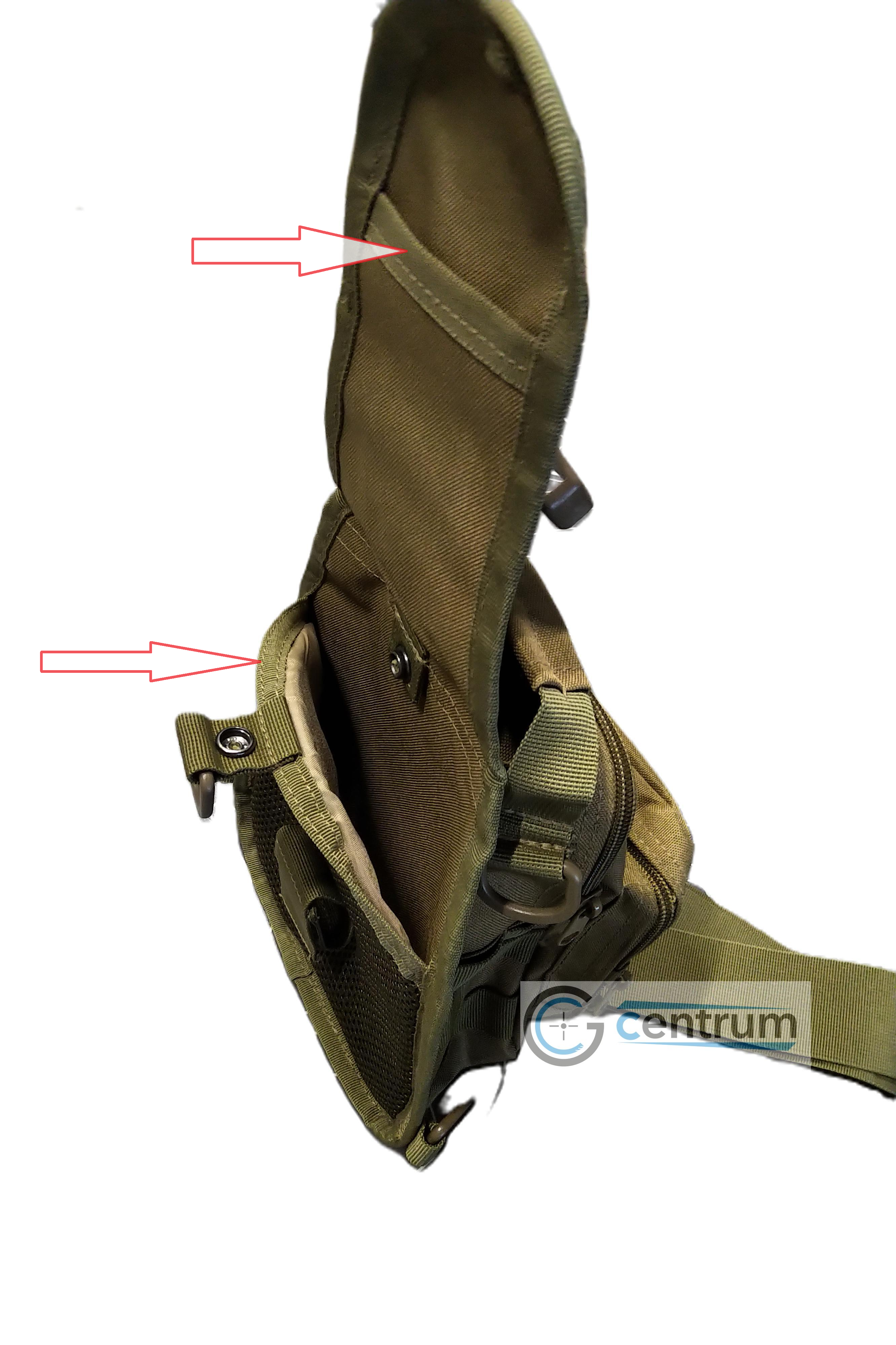 Pokud budete tašku nosit přes rameno, můžete využít dvou skrytých kapes vzadu. Vrchní kapsa se hodí například pro nůž a do spodní si můžete vložit třeba peněženku. Pokud budete chtít připnout pouzdro na opasek, tak se vrchní konec složí a zapne do spodní kapsy. | ![]() |