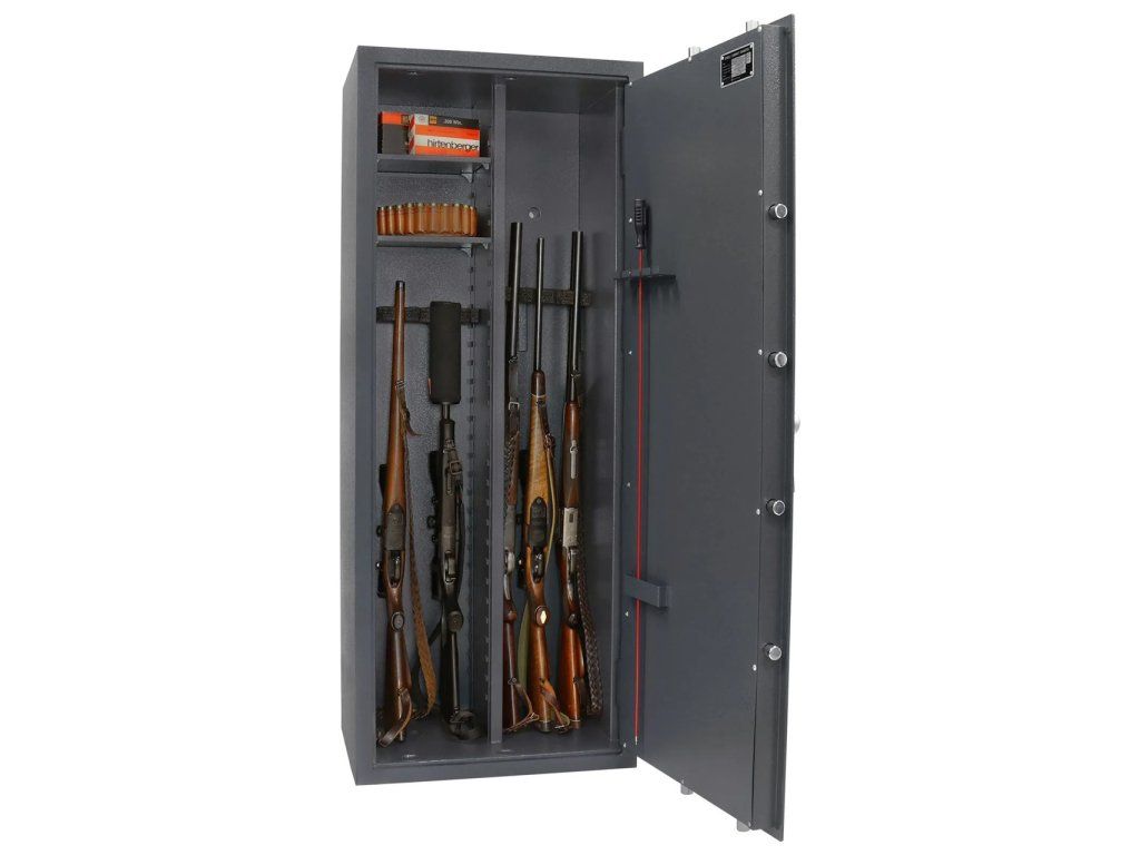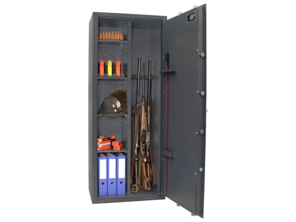 Uvnitř skříně se nachází čtyři vyjímatelné police, které se dají rozmístit podle potřeby. Trezor je možno překonfigurovat na 4 police a místo pro pět zbraní nebo na prostor pro 10 zbraní s jednou či dvěma policemi. V obou částech trezoru je pěnový držák na pět dlouhých zbraní a na vnitřní straně dveří držák na nářadí, například na vytěrák.