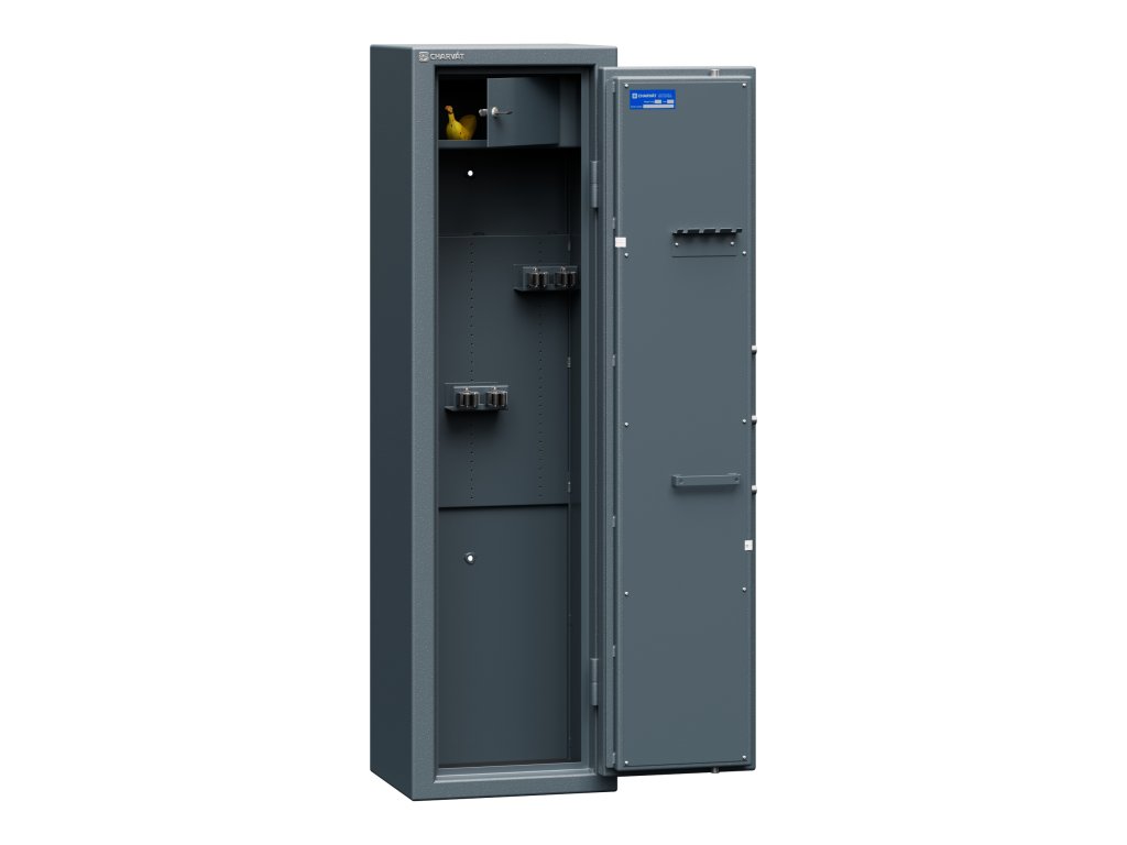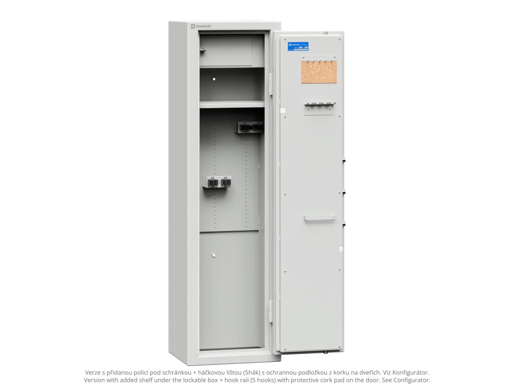 Výškově nastavitelná police umožňuje efektivní uspořádání zbraní a střeliva. Na vnitřní straně dveří je umístěn výrobní štítek s identifikací výrobku. V horní části trezoru naleznete zamykatelnou skříňku. Nadstandardem trezoru je také pětice háčků na vnitřní straně dveří, která dobře poslouží pro zavěšení čistících šňůr, či jiného vybavení.